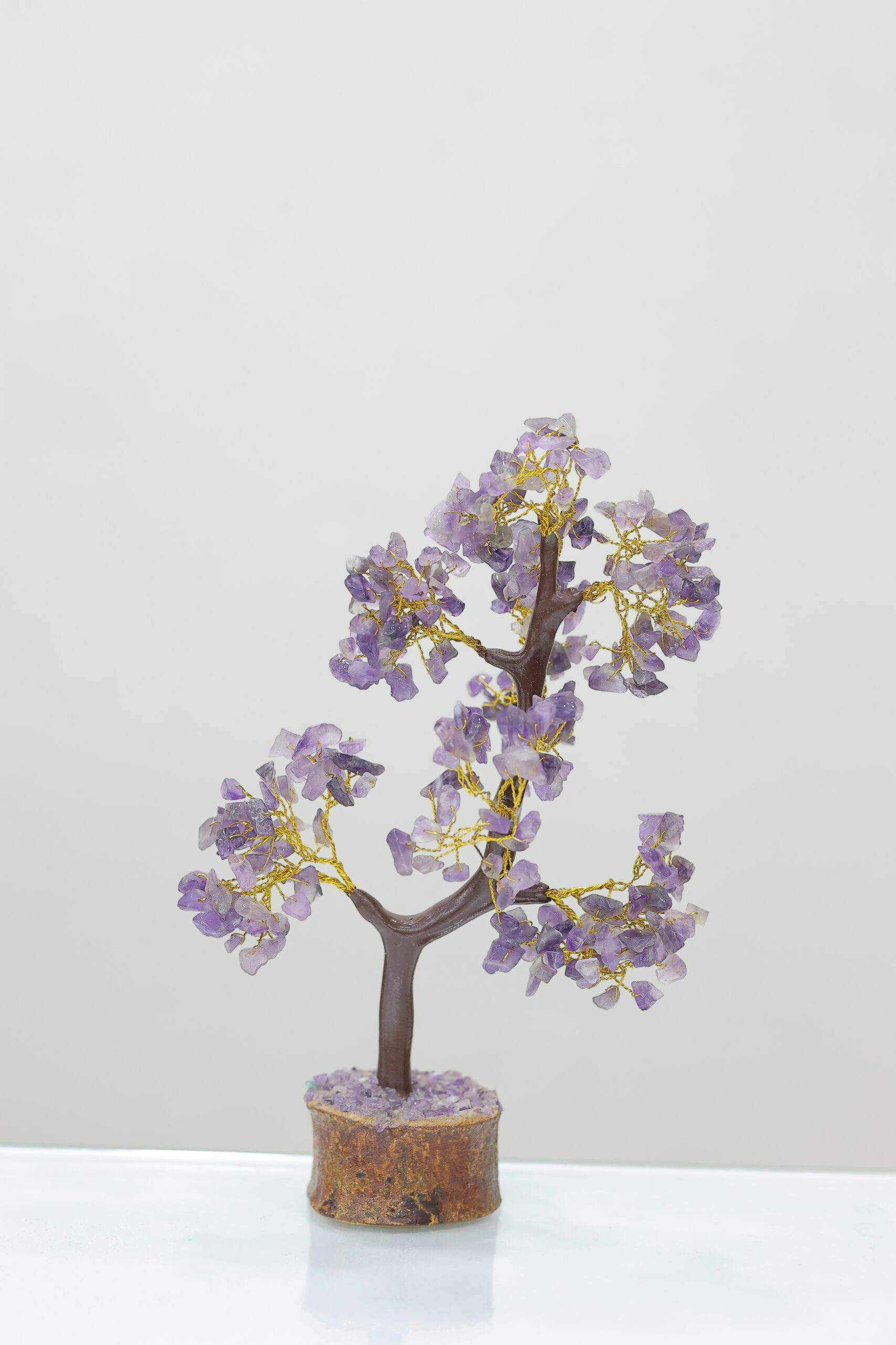 Elegant and soothing, this Amethyst Crystal Gemstone Tree is adorned with delicate purple amethyst crystal chips on golden wire branches. Mounted on a sturdy wooden base, it symbolizes peace, balance, and spiritual growth, adding calming energy to any space.