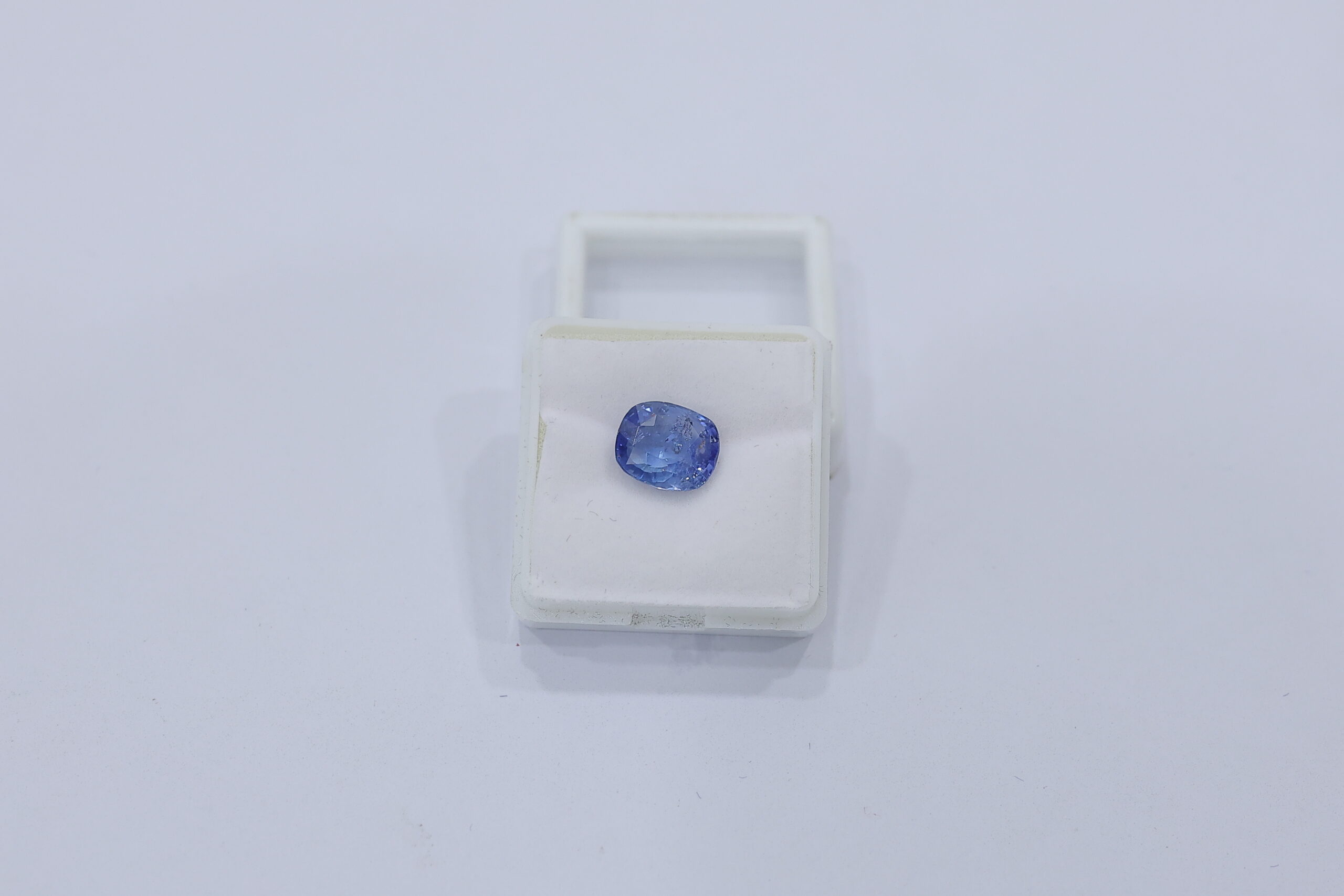 This exquisite Natural Sky Blue Sapphire is an elegant and timeless gemstone, presented in a clear display case. The stone features a classic cushion cut and a soft, captivating light blue color. Its serene hue and beautiful clarity make it a refined choice for sophisticated jewelry.