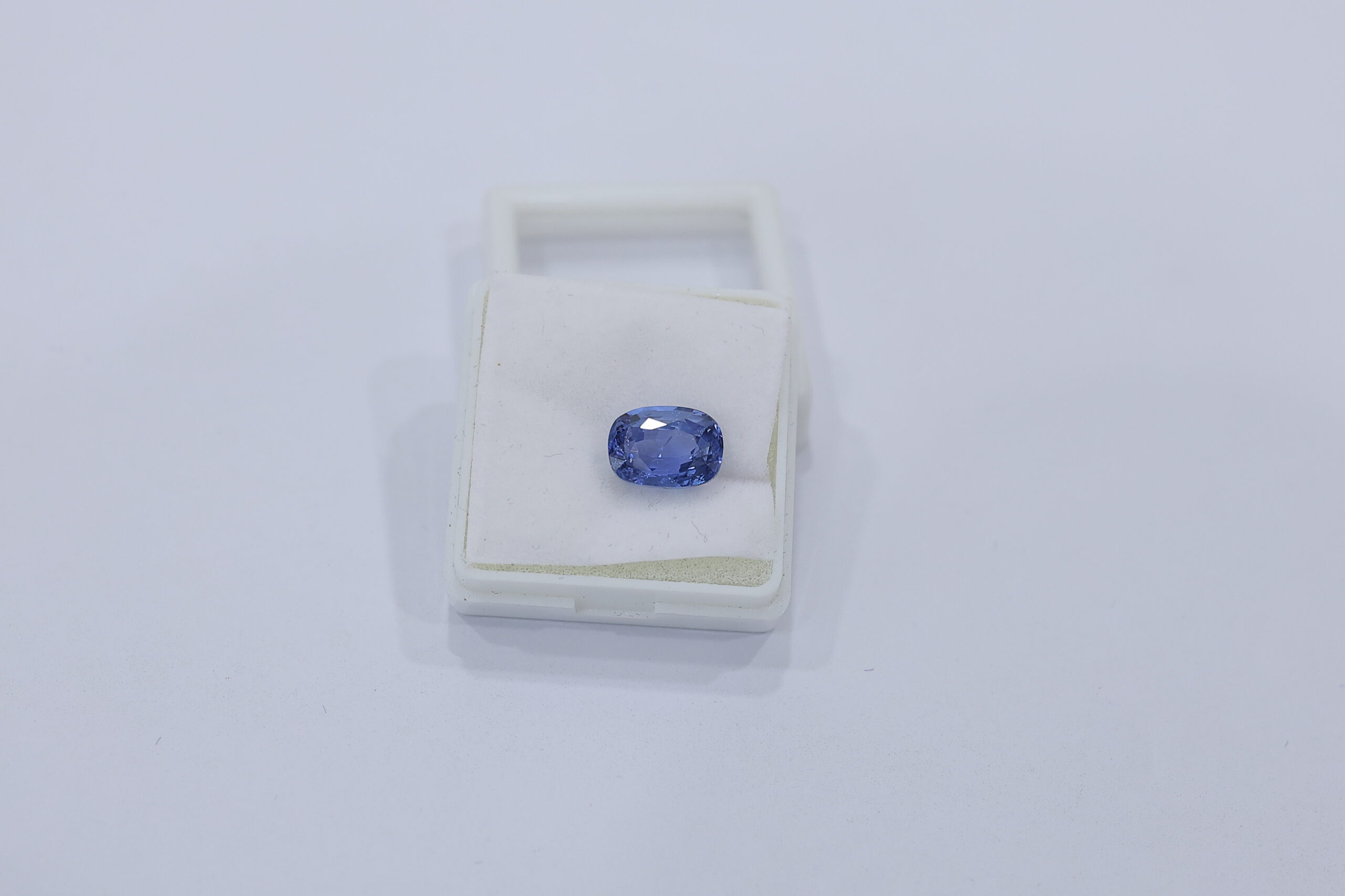 This exquisite Natural Cornflower Blue Sapphire is an elegant and timeless gemstone, presented in a clear display case. The stone features a classic cushion cut and a soft, captivating blue color. Its serene hue and beautiful clarity make it a refined choice for sophisticated jewelry.
