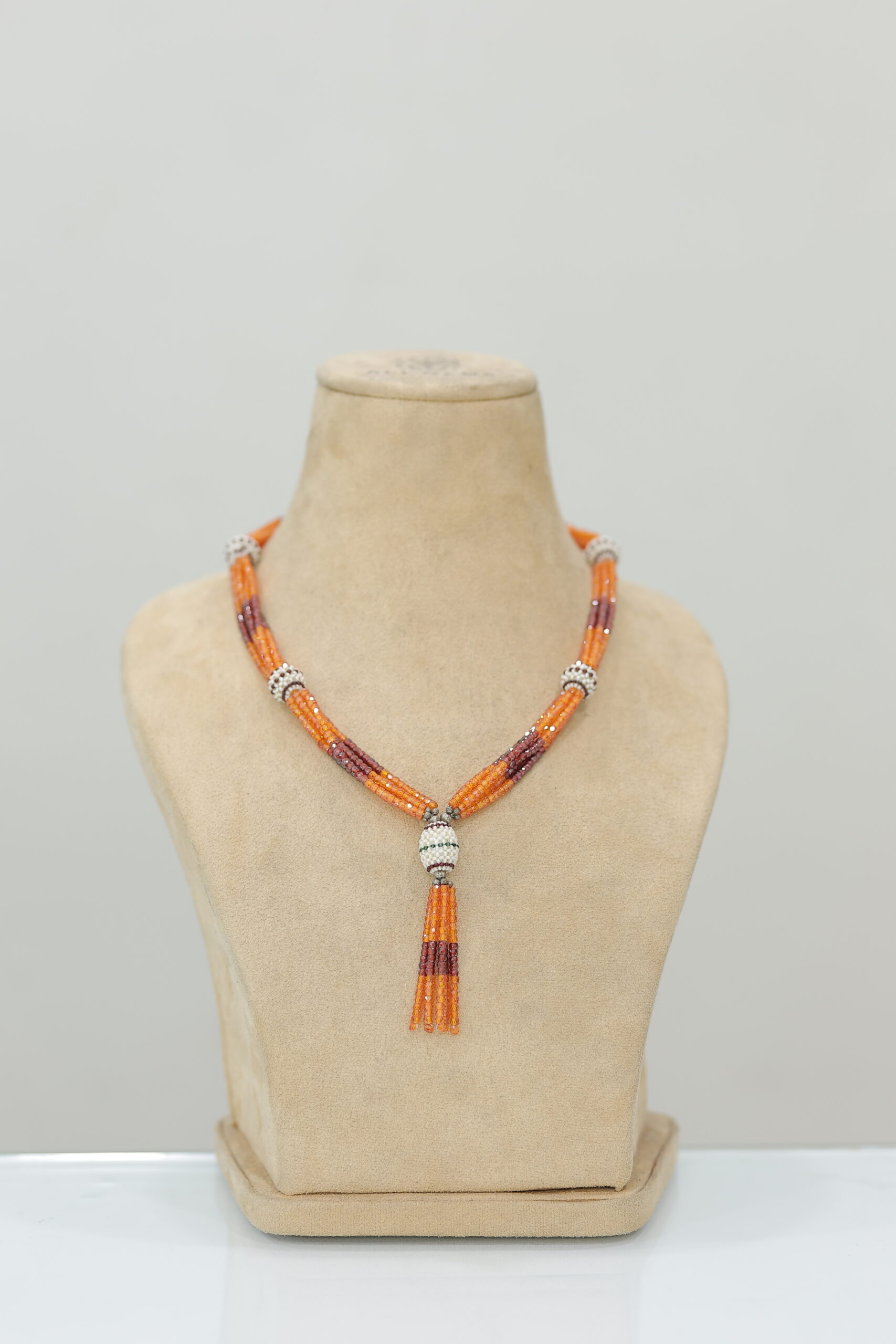 Bold and stylish, this Orange Beaded Tassel Necklace features vibrant orange beads intricately arranged with a chic tassel pendant. Its striking color and unique design make it a standout accessory for adding a pop of personality to any outfit.