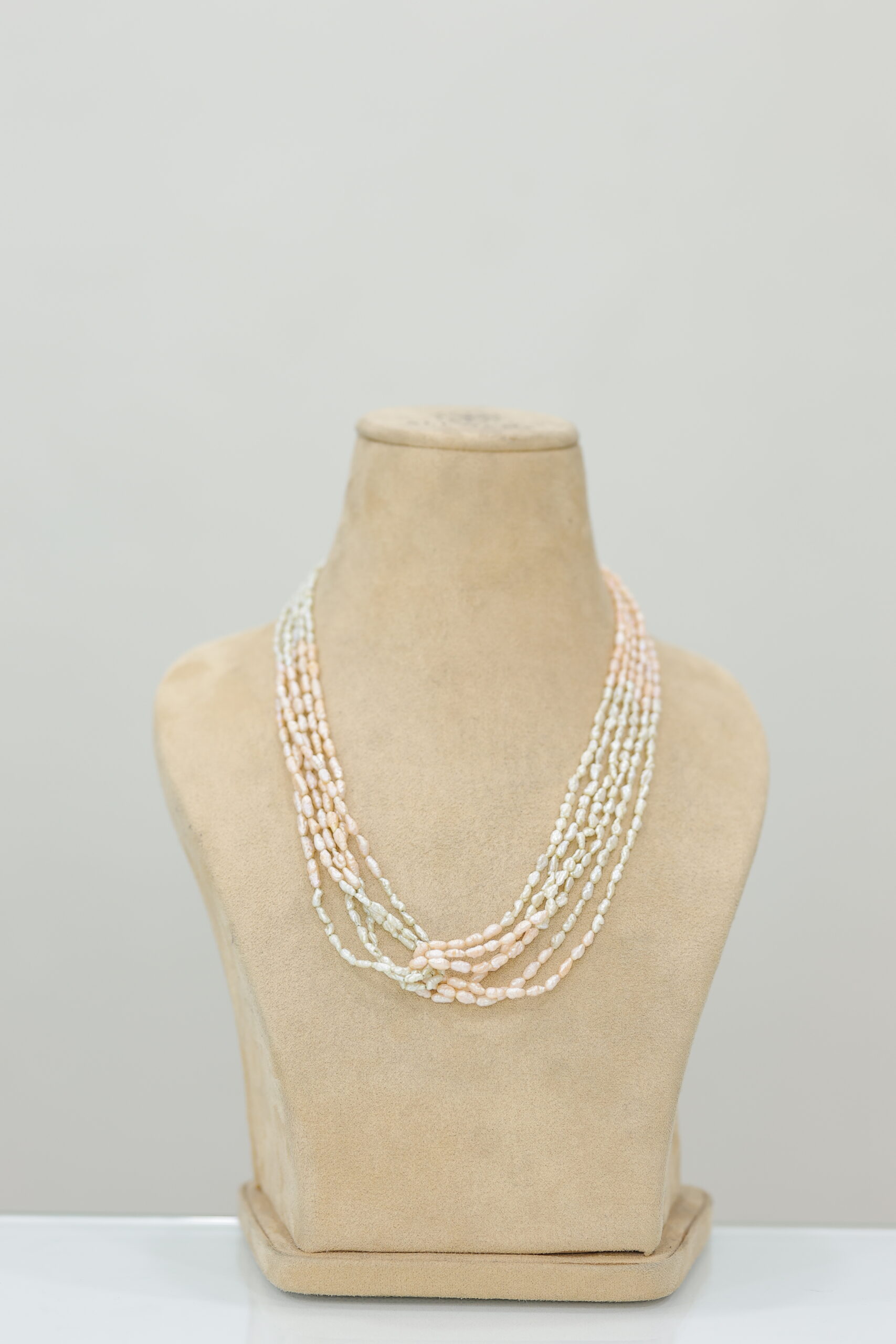 Timeless and elegant, this Pearl Multi-Layer Necklace features lustrous white pearls arranged in multiple graceful layers. Its classic design and radiant sheen make it a perfect statement piece for weddings, formal events, or special occasions.