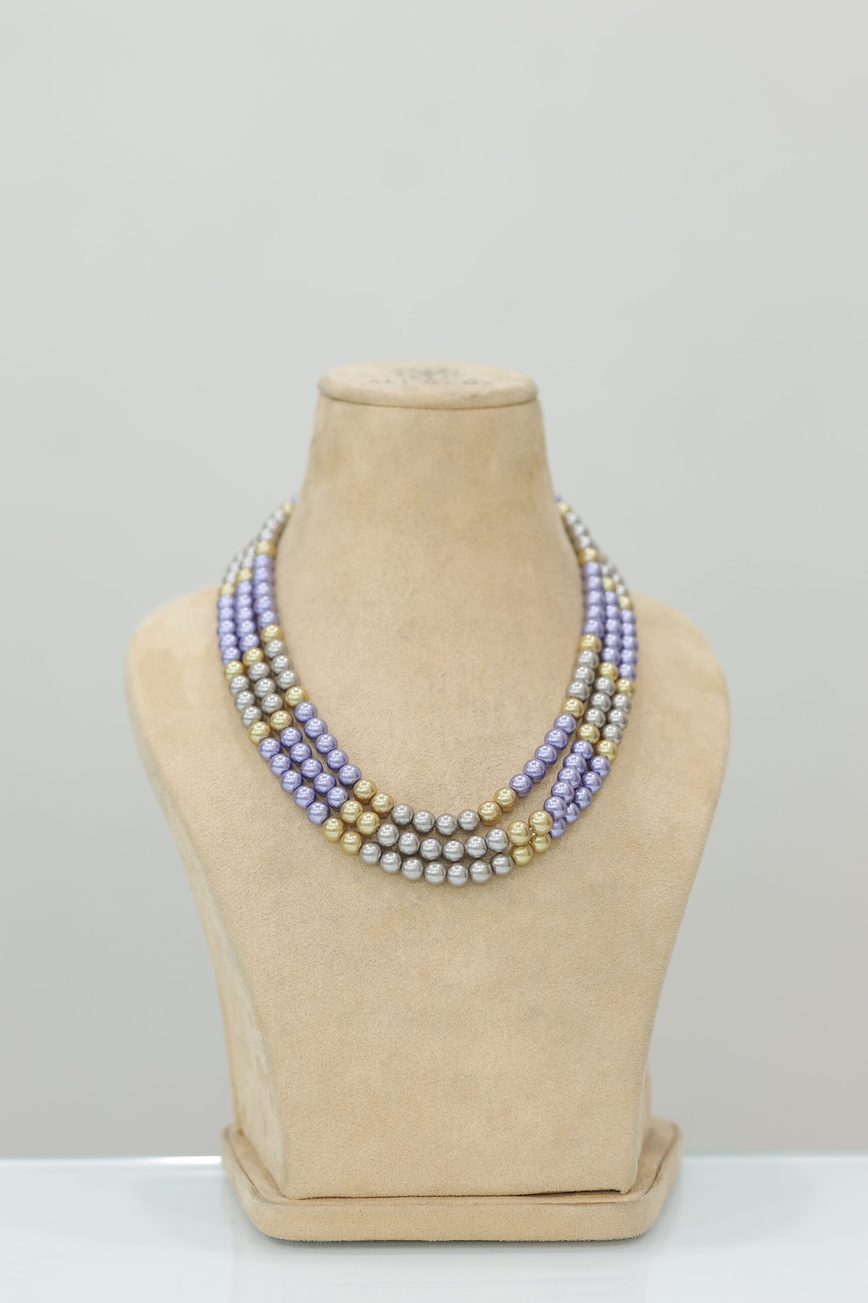 Elegant and vibrant, this Lavender and Gold Multi-Layer Necklace features a stunning blend of lavender and gold-toned beads arranged in three graceful layers. Its soft hues and layered design add a touch of sophistication, making it a versatile accessory for both casual and formal settings.